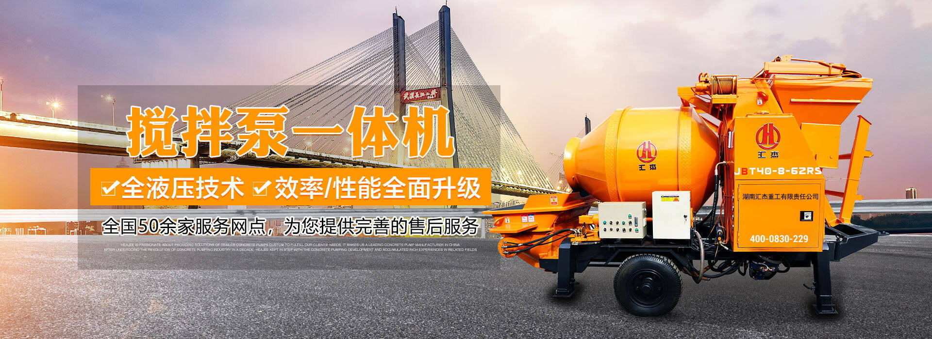 湖南匯杰重工有限責任公司于1999年成立,是一家專業(yè)研制生產HBT40-90系列拖式混凝土輸送泵、JBT系列攪拌一體泵、HBTSD隧道泵、車載式泵、WDB300-800系列穩(wěn)定土拌合站、HZS50-180混凝土攪拌站。